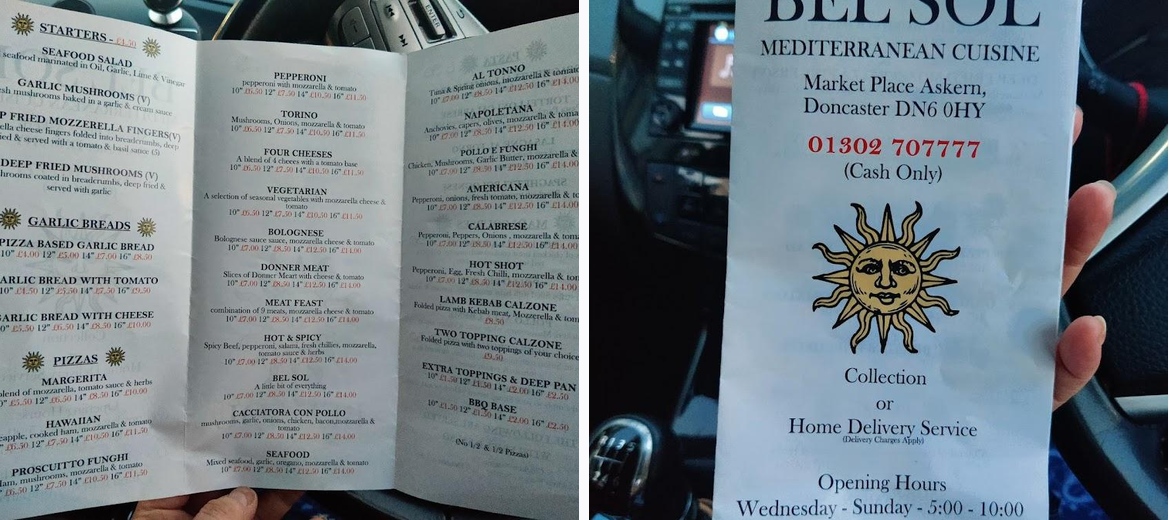 Went for a car ride with intentions to try Benito but it was closed. The decor at Bel Sol caught our eye ...So we ordered a pizza from here . Light thin pizza base just how I like it Great flavour.. partner felt it wasnt *salty* enough but this is my review and I loved it Highly recommend. PS there's a 50p price increase on their menu which is fine as the catering world has been hit hard with rising fuel and stock prices
